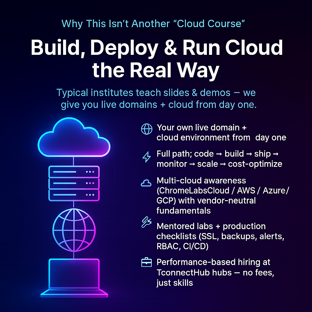 Powered by ChromeLabsCloud, TConnectHub empowers students across India with hands-on cloud access, digital skills, and performance-based hiring — at zero cost.
